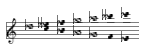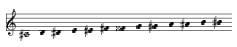 In early works, such as the First Quartet, one cannot expect to find the technique of polymodal composition fully developed, and one should not be surprised if there are details of pitch notation that do not support the polymodal explanation. ‘In our works, as well as in other contemporary works, various methods and principles cross each other,’ Bartók assured in ‘Harvard Lectures.’[15] Yet, in the long run, polymodal thinking is reflected more and more faithfully in his notation. Consider e.g. the first six measures of the Third Quartet (Ex. 12), a crystalline structure with a melody lying above a cluster chord (C#–D–D#–E). The notes of the melody and the accompanying chord form a 13-note scale on C# (Ex. 13), in which the F double-sharp and the G natural must not be understood as two different spellings of the same pitch but as independent modal degrees, the augmented Lydian fourth and the diminished Locrian fifth.