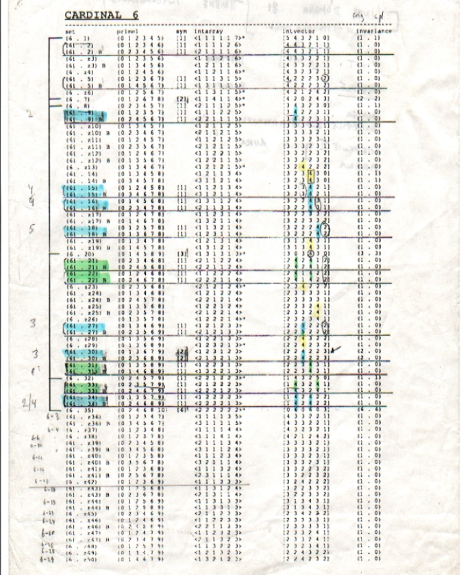 The warehouse from which Lindberg fetches his chords is the cardinality-class 6. Of all chords of this class he normally uses only 13. All these 13 chords have two forms, A and B, which are inversions of each other. In the composer’s chart of cardinality-class 6 they are marked in gray, blue and green (Ex. 1).
