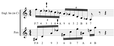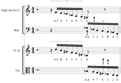 This f1 (indicated with an exclamation mark) is a sign of change; it marks the beginning of a new chaconne cycle where the modal ‘wide-scale’ A is the first harmony. The pitches 4 and 5 (e1 and f1), played by the clarinet and the cello as a shake, and supported by horns, percussion, harp and piano on the first beat of measure 34, make up a dyad on which the two forms (A and B) of the wide-scale A are symmetric (see Ex. 6). This powerful statement of the nucleus of the A chord is then supplemented by descending scale fragments in parallel motion, first of the English horn and the second violin and then of the bassoon and the viola (Ex. 9).