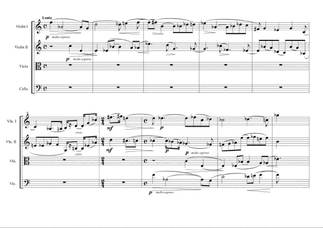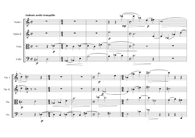 The Quartet begins with a duet of the violins. When we observe their melodic line in the first five measures, we notice that both use eleven tones of the chromatic scale. The missing tones are A in the first violin, F in the second. These tones appear in measure six, where also a rhythmic motive that points to a later development is introduced. It is scarcely unintentional that these tones have been “suspended” up to this point, where the development of the main theme towards a big climax begins. It is even possible to explain without much effort, why these missing tones did not appear in the five previous measures despite their rich chromaticism. We can assume that the second violin avoids the tone F, because it is the obvious tonal centre of the first violin’s melodic line. The missing A in the melodic line of the first violin again may well be explained by the fact that the second violin puts emphasis in measure five on the motive B flat–A–D flat–C that with its different variants is one of the core motives of the whole Quartet.’[28]